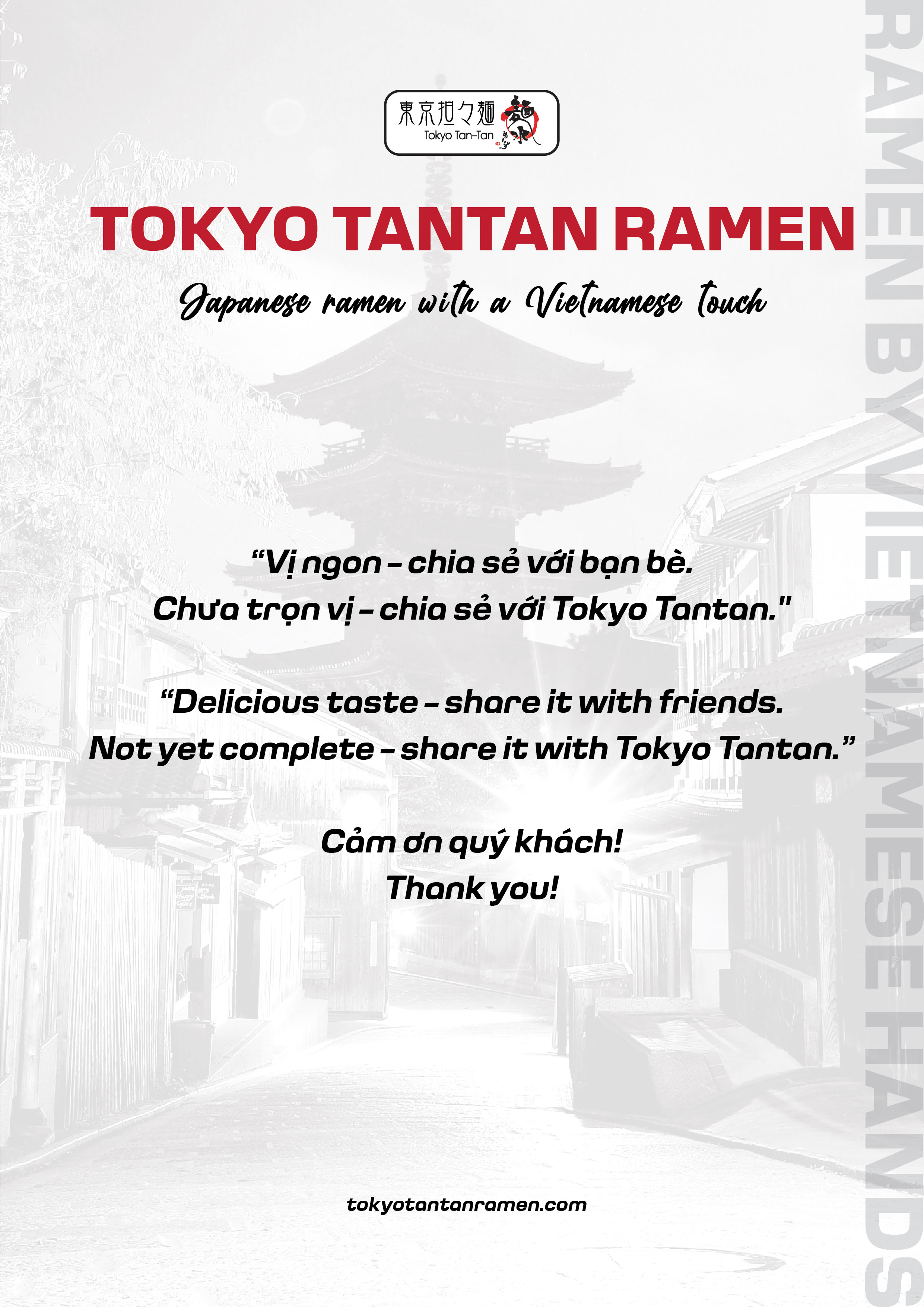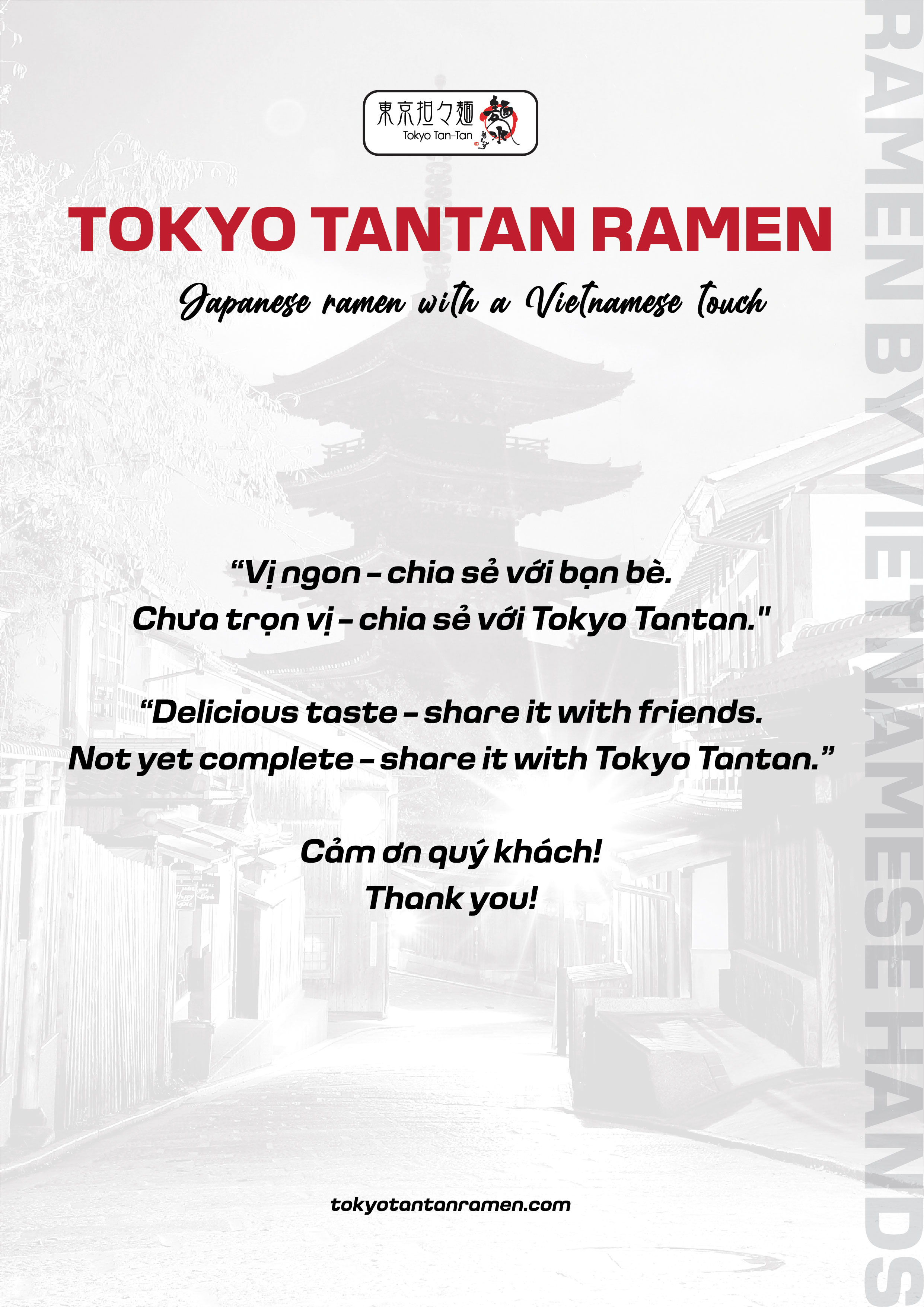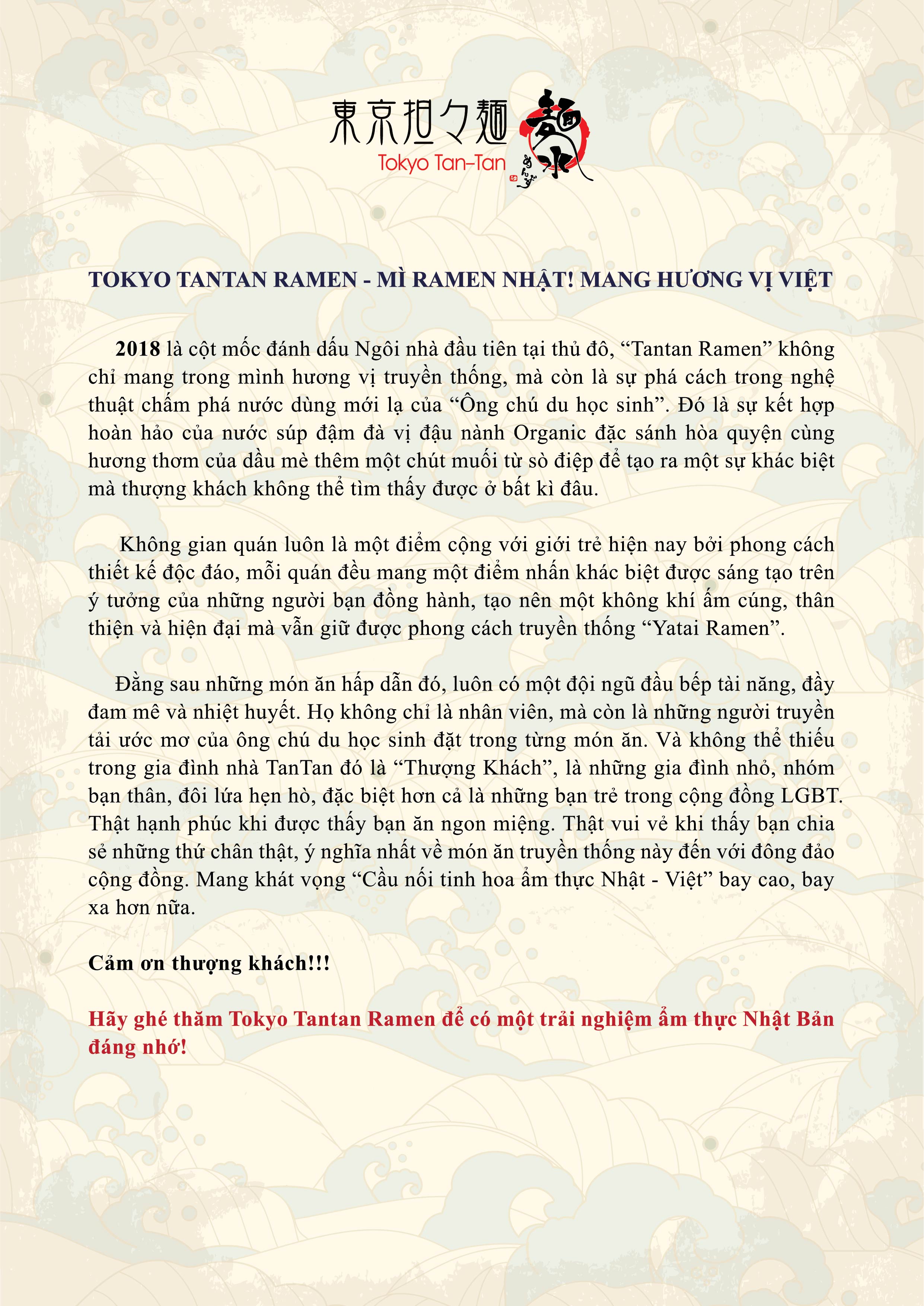 Mang trong mình tâm niệm bồi đắp một không gian kết hợp văn hóa Việt - Nhật, nơi giao thoa giữa nét truyền thống và hiện đại, Tokyo Tantan Ramen sẽ đem đến trải nghiệm ẩm thực đa dạng - thức uống hoàn hảo - dịch vụ chuyên nghiệp và một không gian đậm chất Nhật Bản nhất, để khách hàng an tâm thưởng thức và tận hưởng trọn thi vị ẩm thực xứ hoa anh đào.