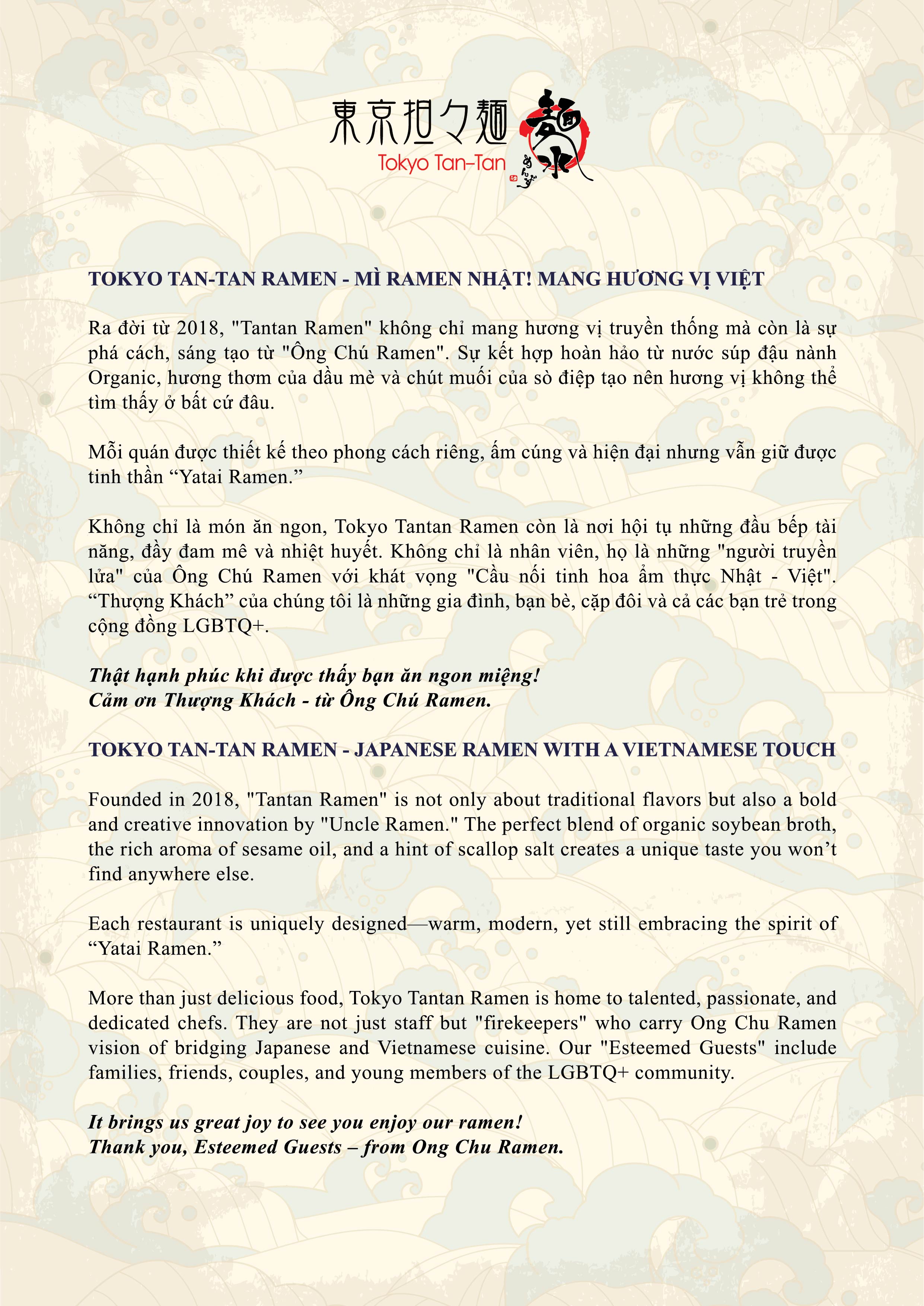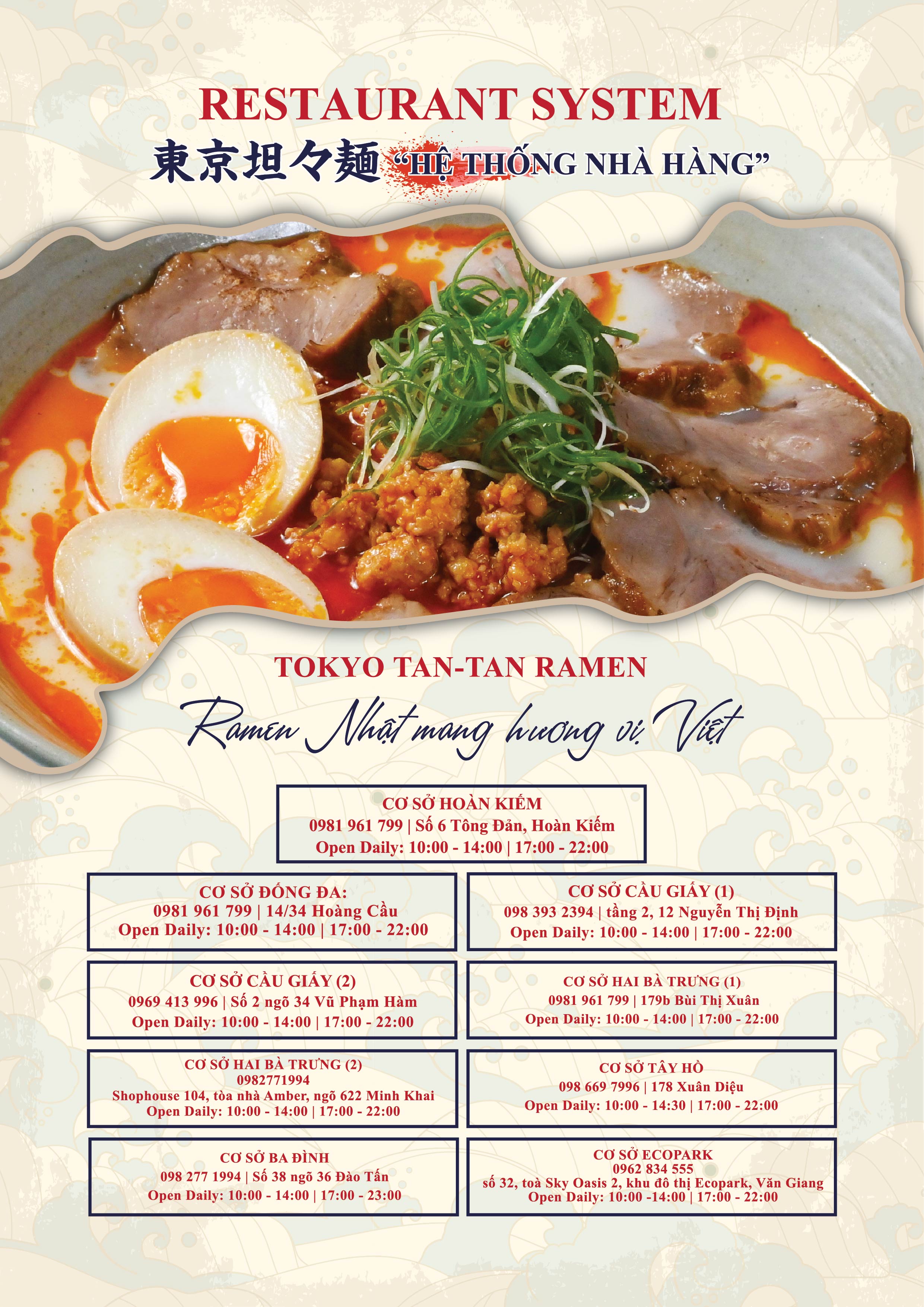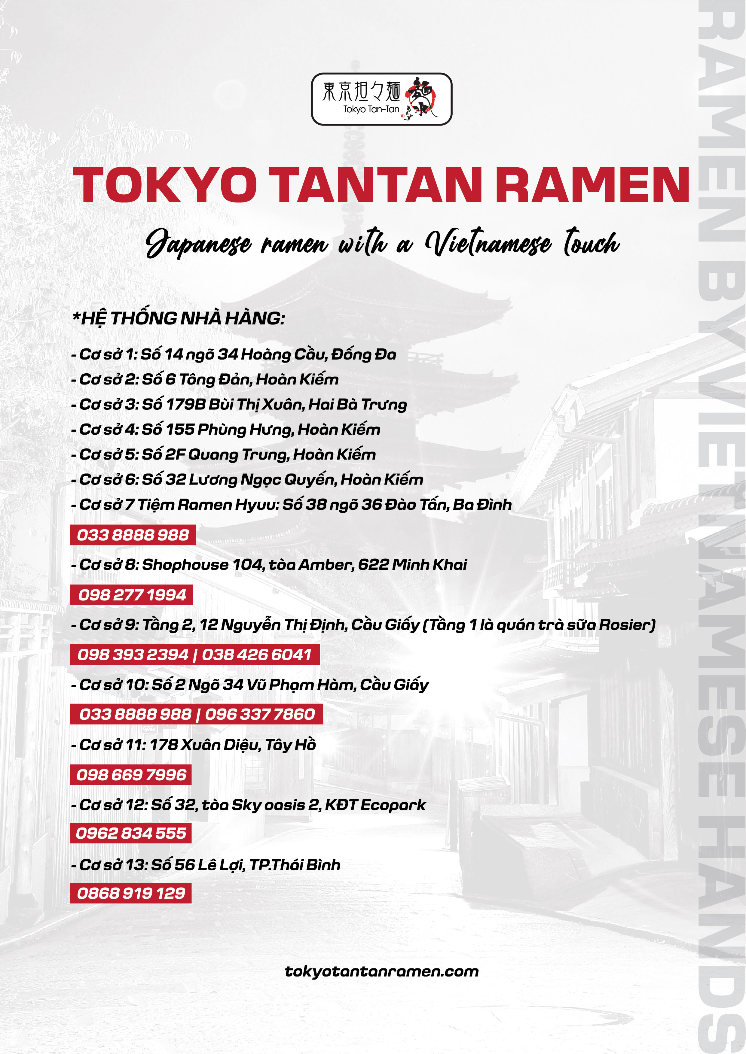 Mang trong mình tâm niệm bồi đắp một không gian kết hợp văn hóa Việt - Nhật, nơi giao thoa giữa nét truyền thống và hiện đại, Tokyo Tantan Ramen sẽ đem đến trải nghiệm ẩm thực đa dạng - thức uống hoàn hảo - dịch vụ chuyên nghiệp và một không gian đậm chất Nhật Bản nhất, để khách hàng an tâm thưởng thức và tận hưởng trọn thi vị ẩm thực xứ hoa anh đào.